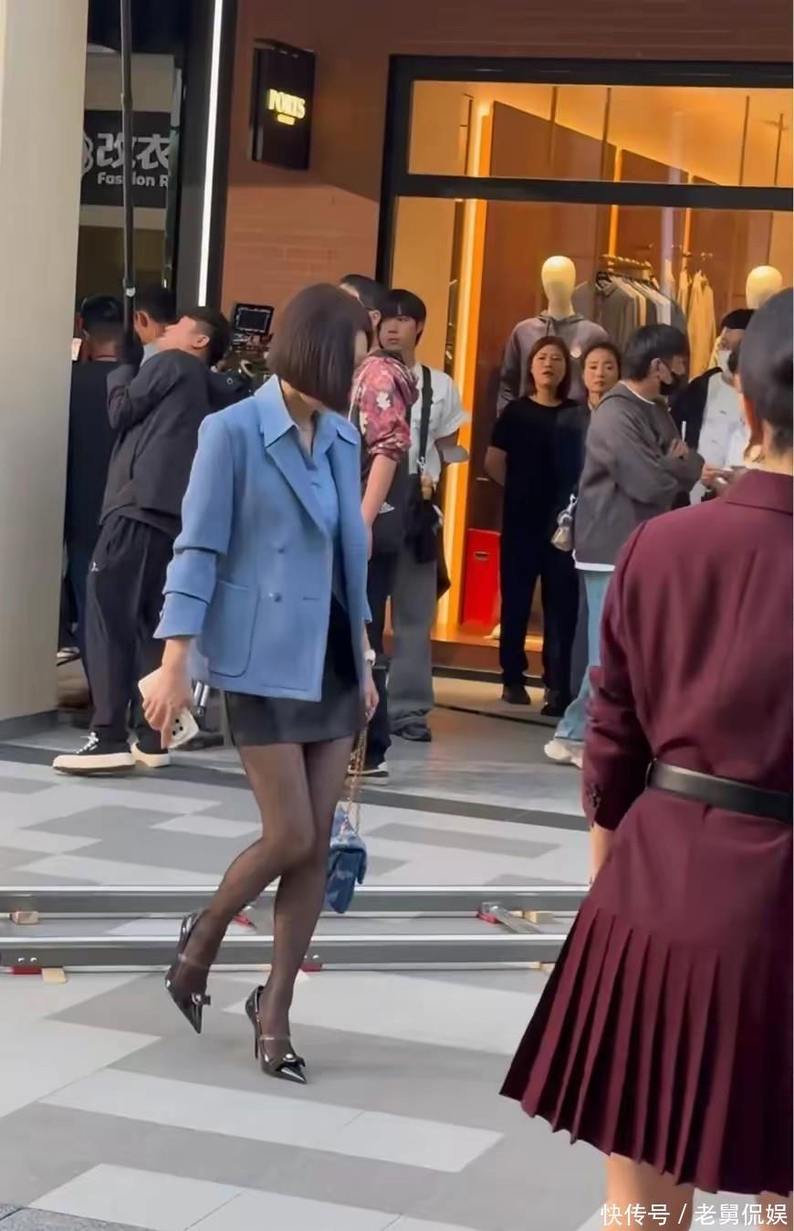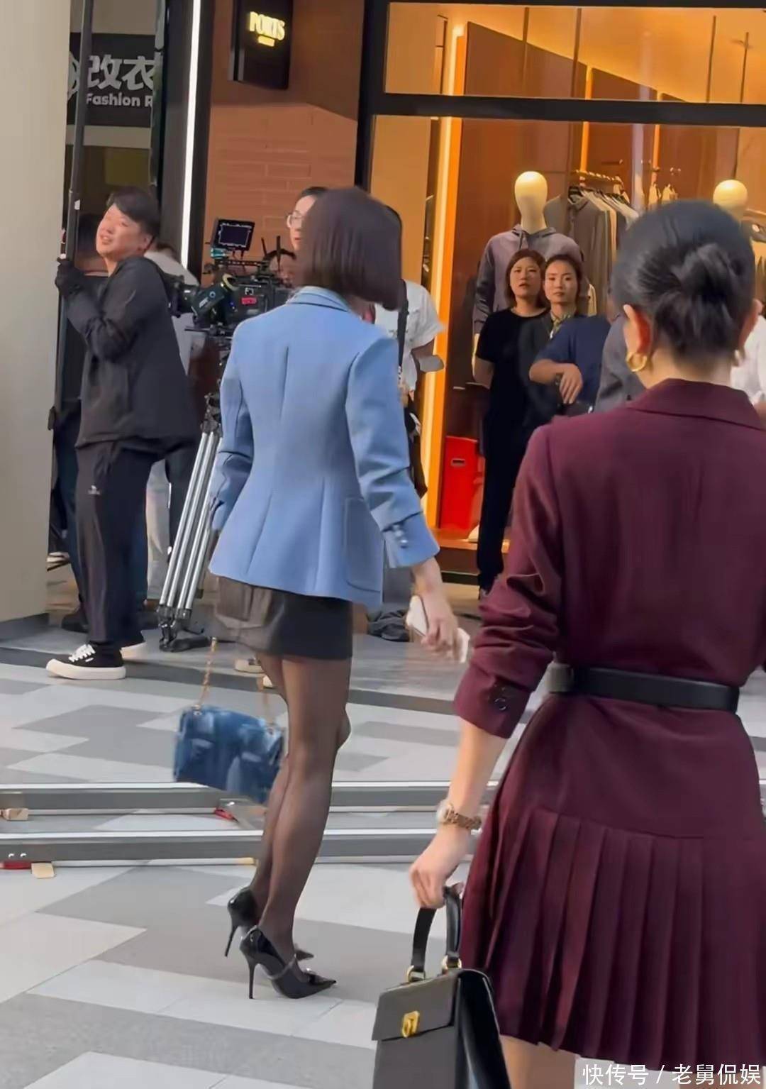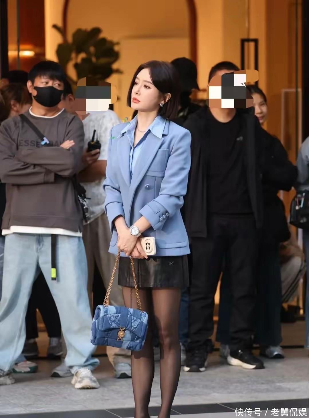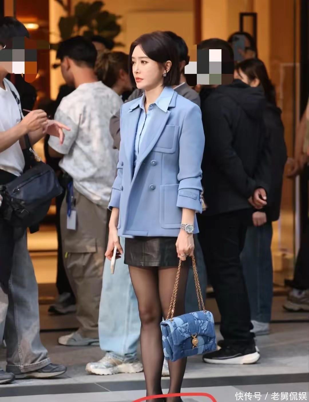 当天,秦岚身穿一件蓝色外套,搭配经典黑色丝袜,整体造型干练又不失女人味。她长发披肩,妆容淡雅,面对路人的拍照请求时始终面带微笑,亲和力十足。然而最引人注目的,是她脚上那双被透明胶带缠绕着的高跟鞋——鞋底与鞋面连接处可见清晰的胶带痕迹,但秦岚行走间依然从容自若,仿佛穿着限量款新品。